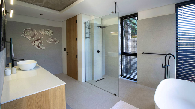 This spacious villa comfortably accommodates up to eight guests in four tastefully decorated bedrooms. Three of the rooms feature king-size beds and en-suite bathrooms, while the fourth is fitted with a queen-size bed. The main suite is designed with a full bathroom that includes both a bath and shower, and the remaining en-suites are equipped with showers. Guests are provided with crisp linen, bath towels, and swimming towels for their stay. The open-plan living and dining area forms the centrepiece of the villa. A sleek, fully equipped kitchen with a fridge-freezer, stove, oven, microwave, and tea and coffee facilities flows into a stylish lounge and dining space. A Smart TV with selected DStv channels, a sound system, a fireplace, and complimentary Wi-Fi add to the comfort, while underfloor heating and air-conditioning ensure the home is perfectly suited for every season. Glass doors open from the living area onto a terrace designed for relaxation and entertainment, complete with a bar counter and built-in braai. Guests can enjoy the plunge pool, unwind on the furnished patio, or take advantage of the refreshing outdoor shower. Secure on-site parking is also available.