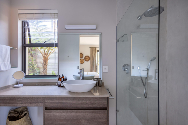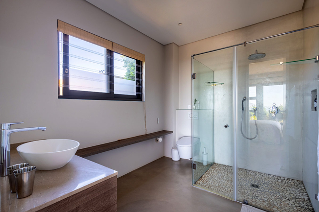 Each of the bedrooms is tastefully furnished, with modern en-suite bathrooms. The master bedroom is located upstairs and opens onto the main deck area, while the three downstairs bedrooms lead out to a patio walkway. For cooler evenings, the villa is equipped with a cosy wood-burning fireplace, and guests can enjoy sundowners around the firepit.