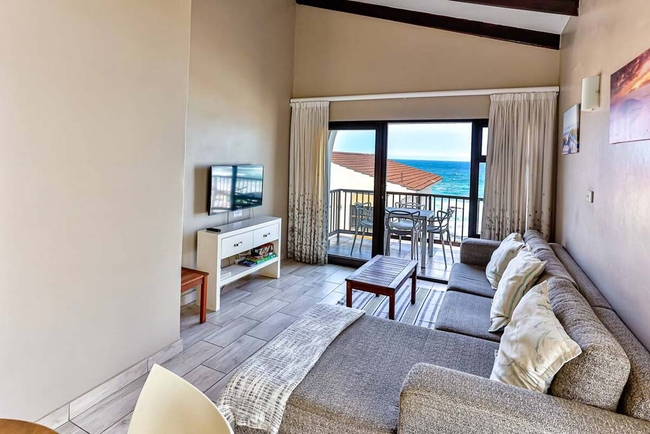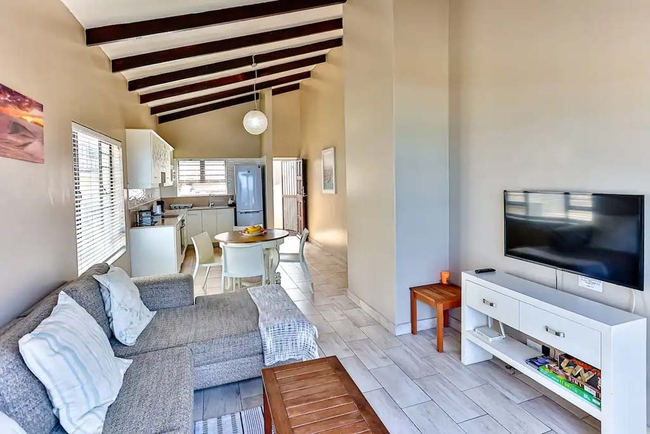 The open-plan living area flows onto a private balcony, offering a partial sea view where you can enjoy the coastal breeze. The apartment also comes with a Smart TV and Wi-Fi, allowing guests to log into their own Netflix or DStv accounts for entertainment.