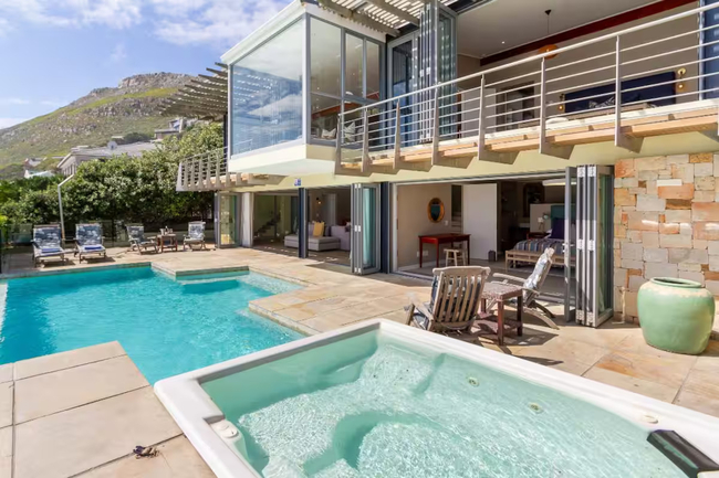 This stylish villa is meters away from the Atlantic Ocean and offers peaceful holiday accommodation in Cape Town in a spectacular setting. There is no better way to watch a sunset or the whales frolicking in the bay ahead. It has have been designed in such a way to take full advantage of these breathtaking views.