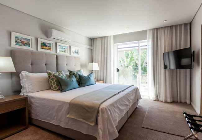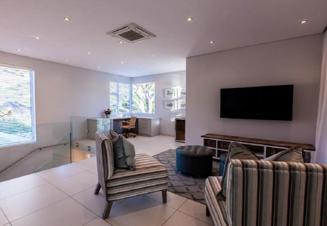 Villa on 1st Crescent is air conditioned and has four en-suite bedrooms. Each room is furnished with a King-size bed and the en-suite bathrooms have a shower, bath or both. The fully equipped kitchen contains all the equipment necessary for self catering. The main open plan living area on the lower level of the villa leads to an enclosed terrace, which has a built-in bar area, patio furniture and glass doors that open to the garden. The garden has a splash pool and a kiddies play area, as well as gas braai facilities and a Jacuzzi overlooking the ocean. Free Wi-Fi and satellite TV is provided. The house is serviced daily and off street parking is available.
