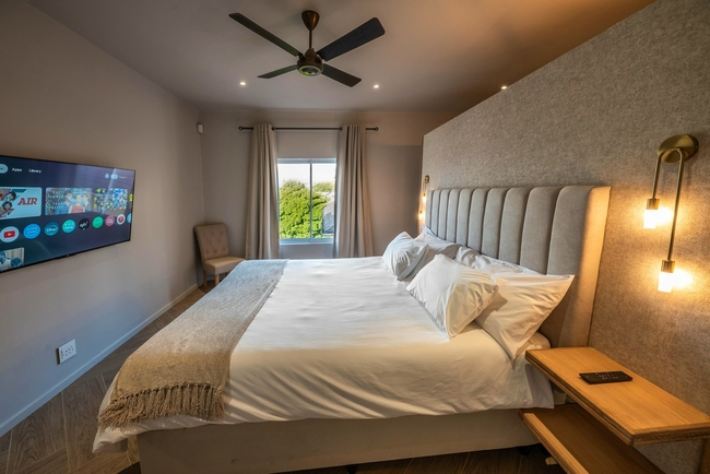 Outdoors, guests can make use of a neatly maintained garden complete with a braai area and comfortable seating, offering an excellent space for relaxed open-air dining while taking in the sunset. Secure on-site parking is also provided for added convenience.