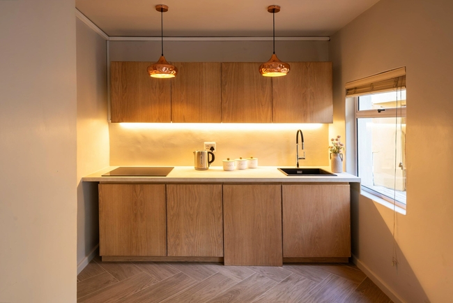 The interior living spaces are both functional and inviting, with a fully equipped kitchen that includes a gas stove, oven, microwave, kettle, toaster, fridge-freezer, dishwasher, washing machine, and tumble dryer, complemented by a central island with seating. A cosy fireplace enhances the kitchen area, adding warmth and atmosphere.