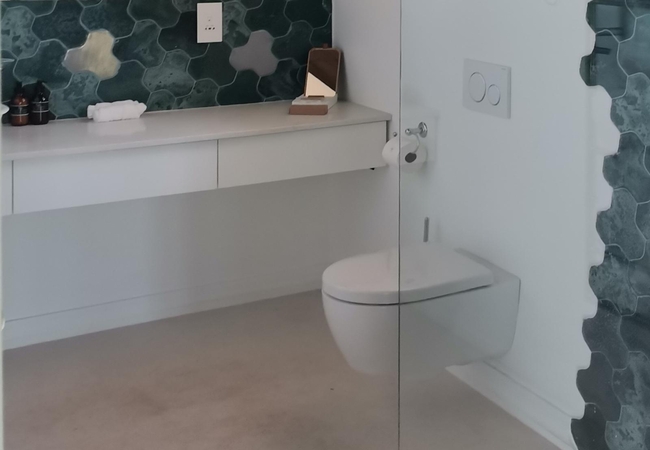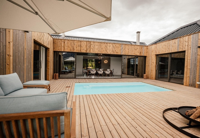 Immerse yourself in the serene and elegant ambience of Ludus Magnus Villa Stanislasis a holiday villa in Franschhoek on the Ludus Magnus estate. The villa has three bedrooms each furnished with a King-size bed. Each room has an en-suite bathroom fitted with a shower, toilet and basin. The rooms are equipped with a flat screen TV, air-con, mini-bar fridge with complimentary soft drinks, plush gowns, electronic safe and blackout curtains. Sliding doors open onto one of the decks and pools. Bathrooms are beautifully finished and kitted out with L/M luxury amenities. A modern open-plan and state-of-the-art fully equipped kitchen includes a wood braai (BBQ), Le Creuset crockery and utensils, dishwasher, tumble-dryer and washing machine. The villa has a stylish lounge and dining area with 8 seater table, floating fireplace, semi-separate TV zone with chillout couch, Sonos surround sound system and air-con unit. Daily cleaning service included.