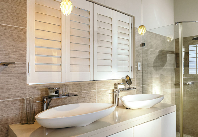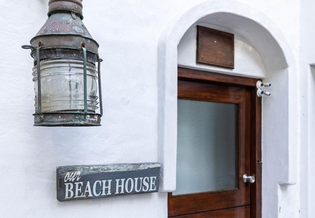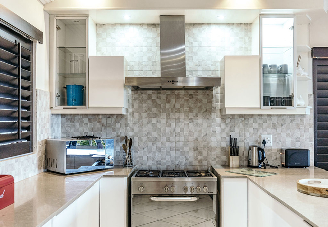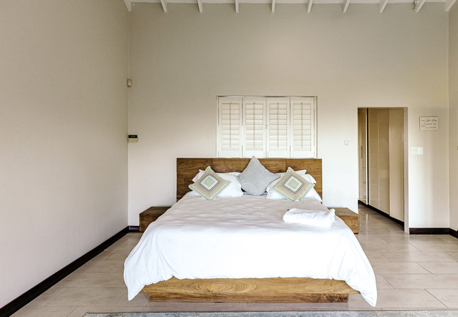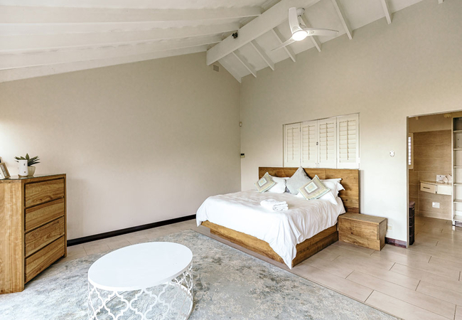 The main house has five bedrooms.There is a lounge and fully equipped kitchen. Plush white leather couches face the sliding door in the living room, looking out into the lawn. Bed configurations range from double beds, twin beds and bunk beds and can accommodate up to eighteen guests. There are three bathrooms in the main house.