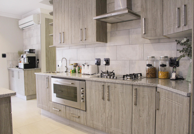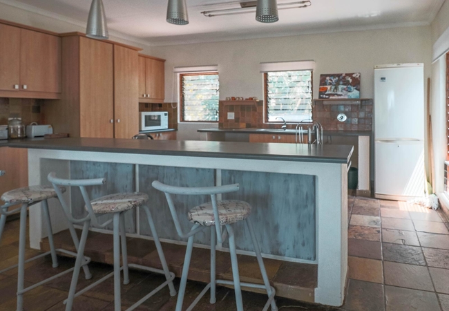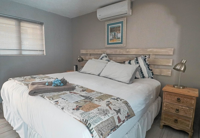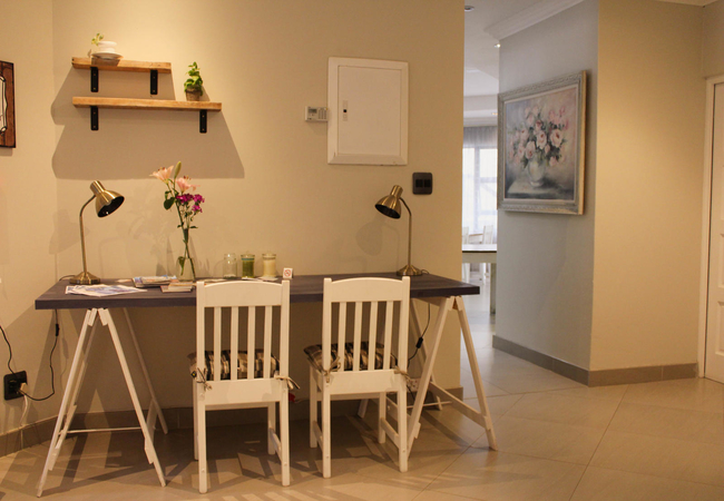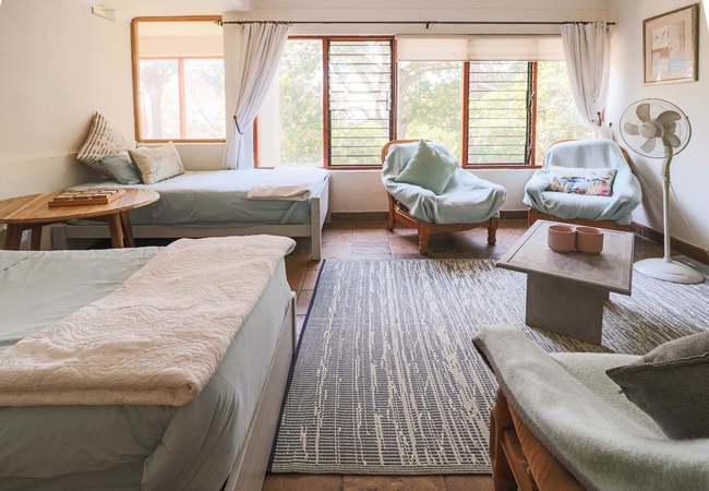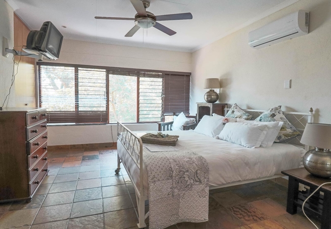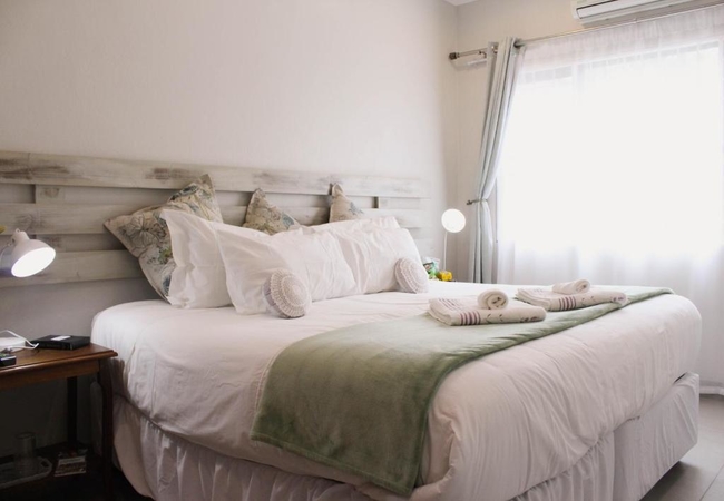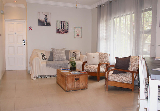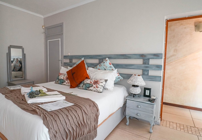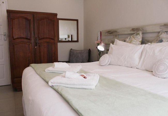 Family Room furnished with one Super King size bed and one three-quarter bed. There is also a sleeper couch for one additional child under 12. En-suite bathroom with shower, wash basin and toilet. The guest house has beautifully furnished rooms with their own en-suite bathrooms. The rooms are cleaned daily and breakfast is included with each room, except in the self-catering rooms. There is secure parking for guests' vehicles as well as braai facilities on the premises.