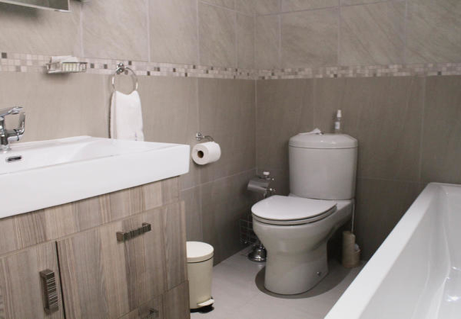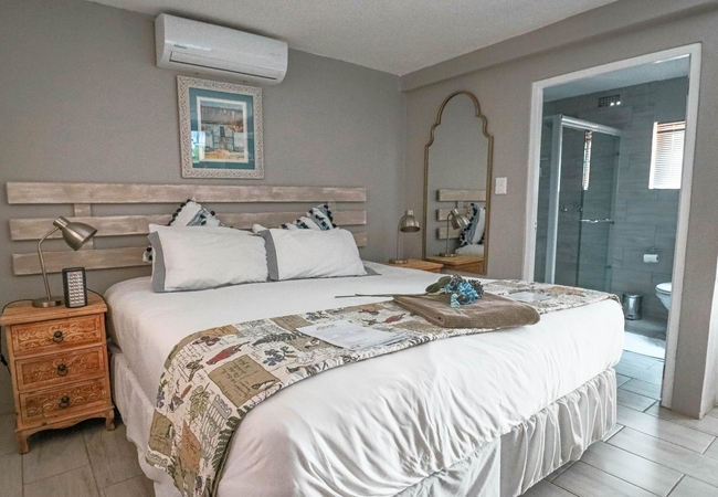 Luxury Suite with furnished with one Super King size bed (or Twin on request). En-suite bathroom with bath, shower, wash basin and toilet. The guest house has beautifully furnished rooms with their own en-suite bathrooms. The rooms are cleaned daily and breakfast is included with each room, except in the self-catering rooms. There is secure parking for guests' vehicles as well as braai facilities on the premises.