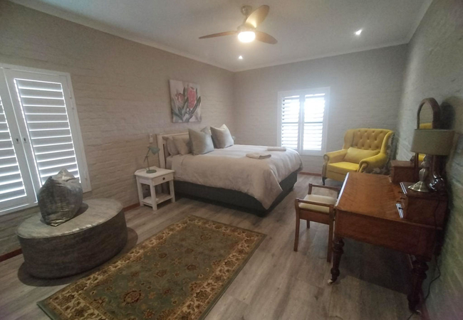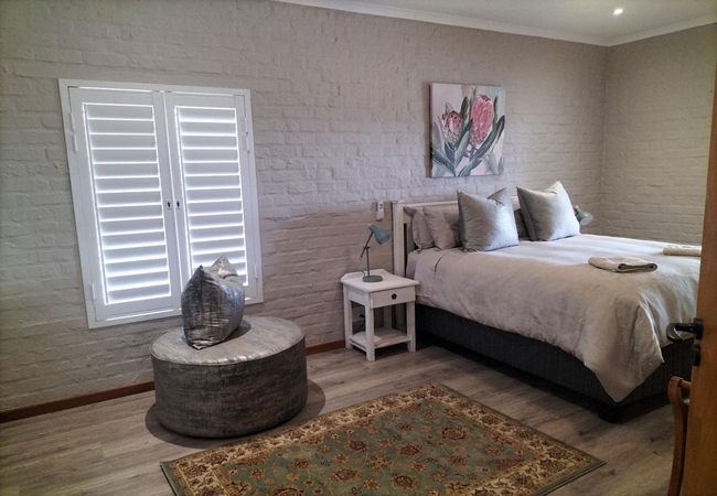 Vineyard Villa 1 is a semi-detached cottage in Stanford that has one bedroom furnished with a Queen-size bed. The en-suite bathroom is fitted with a bath, shower, toilet and basin.