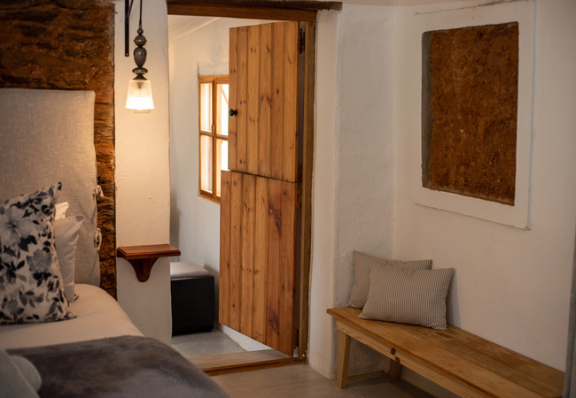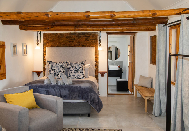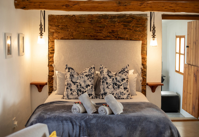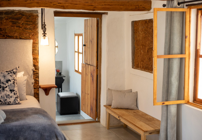 The "Honeymoon Suite", this unique cottage has a spacious bedroom with a Queen-size bed and a modern, full bathroom. There is a fully equipped kitchen and a living room with a fireplace. There is also a large stoep area with braai facilities and a breathtaking view of the Swartland. The bedroom and the living room open out onto the stoep. The cottage is suitable for two people and has air-conditioning.