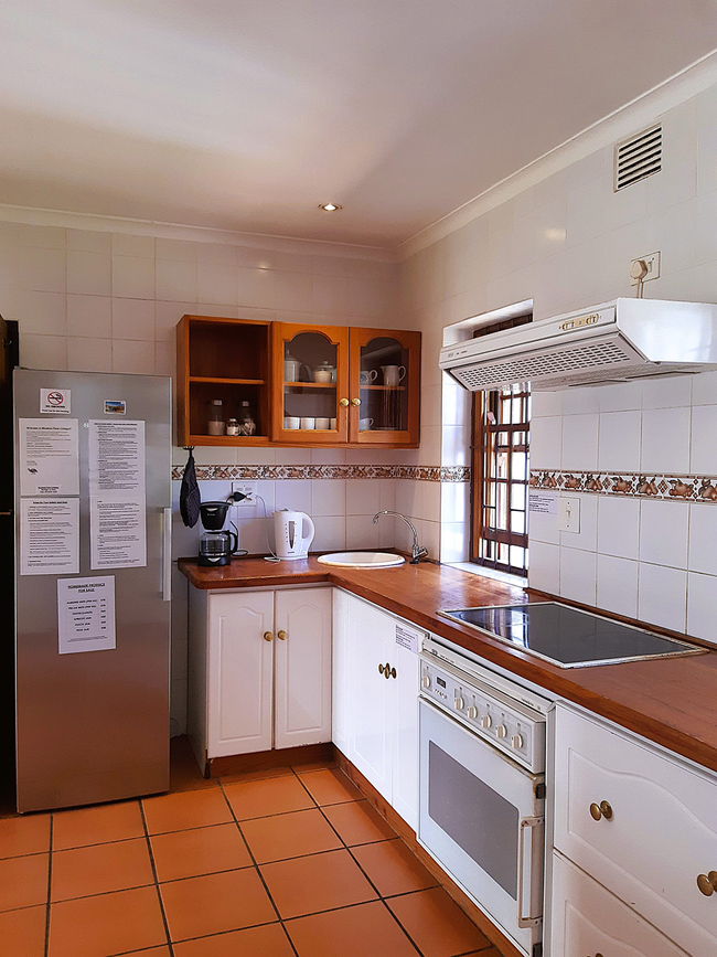 There is a fully equipped spacious and modern kitchen with a glass-top stove / oven, microwave, fridge, chest freezer and separate scullery with dish washer. The living area has a dining table, fireplace, a TV with DStv and Wi-Fi.