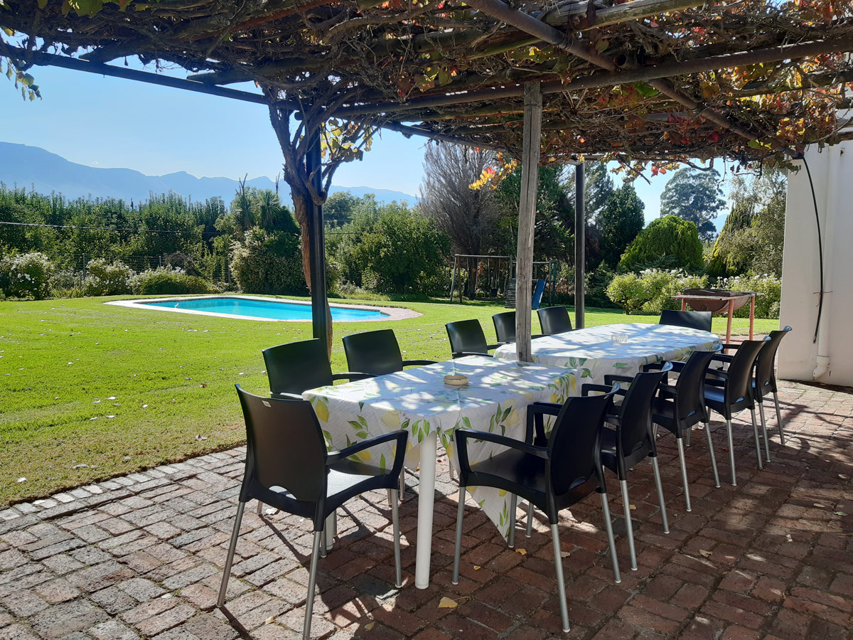 Outside there is a vine covered patio overlooking the garden and swimming pool. There are braai facilities and an enclosed garden with big lawn and private salt-water pool, close to the foot of the mountain.
