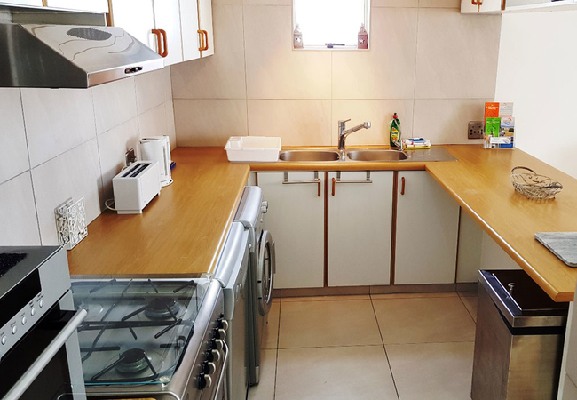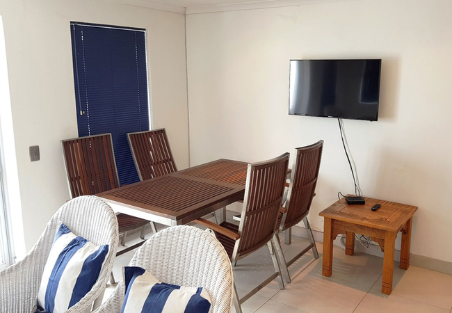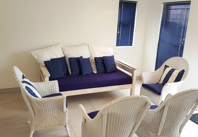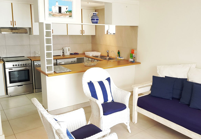 This kitchen is fully equipped for self catering and includes a dishwasher and washing machine. The living area is comfortably furnished and has a TV with satellite channels. This are leads onto a balcony with a built in braai.