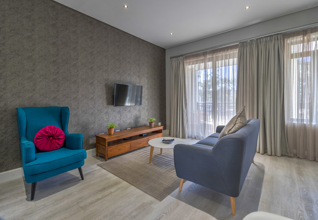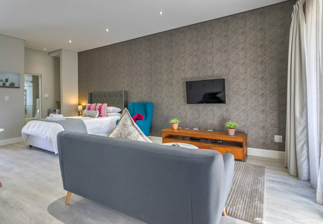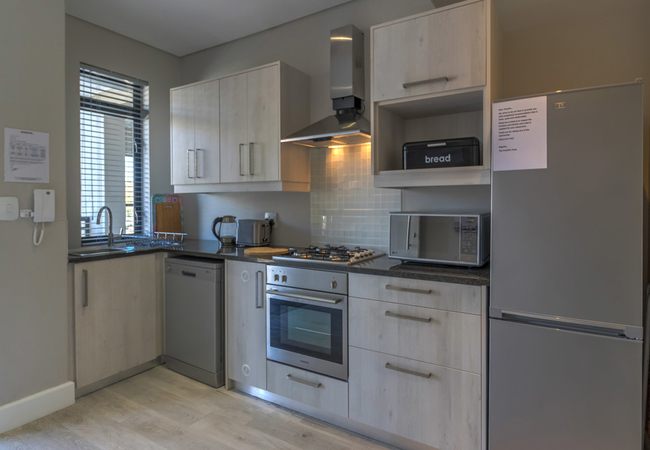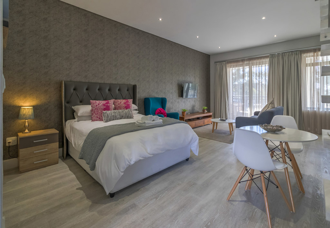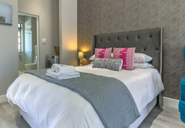 The kitchen is fully equipped for self-catering and has a stove, oven, fridge / freezer, microwave, dishwasher, and cutlery and crockery. The unit also features a washer dryer combo. The dining area has seating space for two guests, while the lounge has a comfy lounge suite and a wall-mounted flat-screen TV with selected DStv / satellite channels. Free Wi-Fi access is also provided.