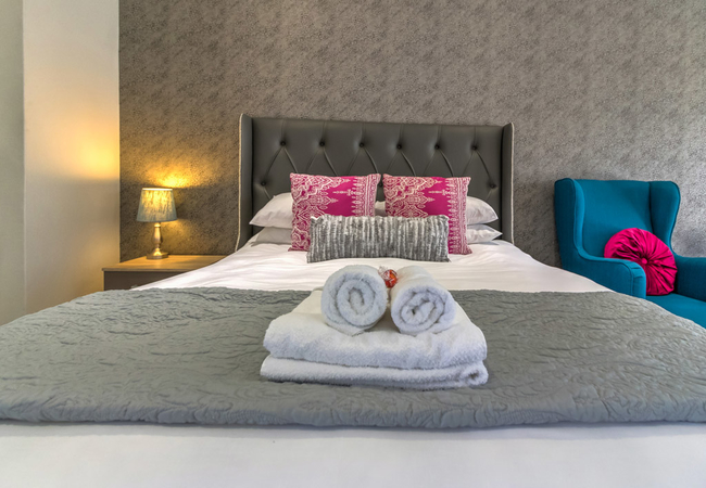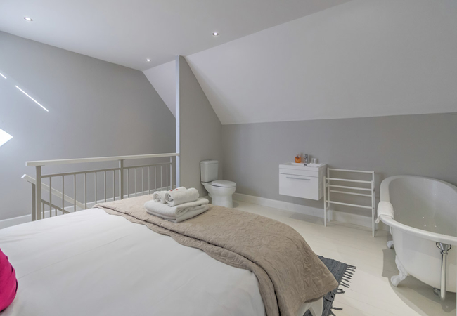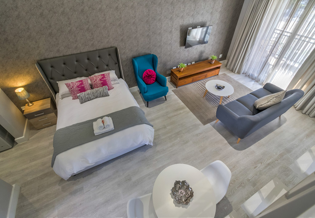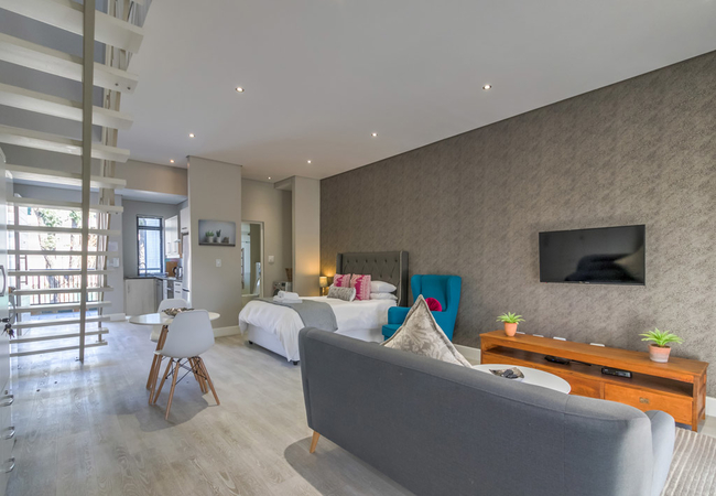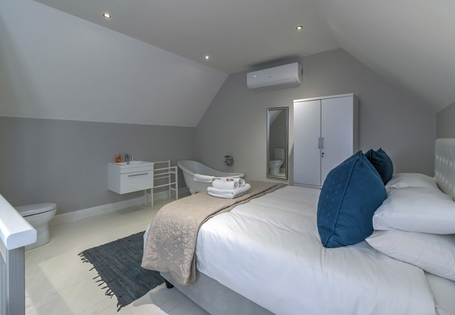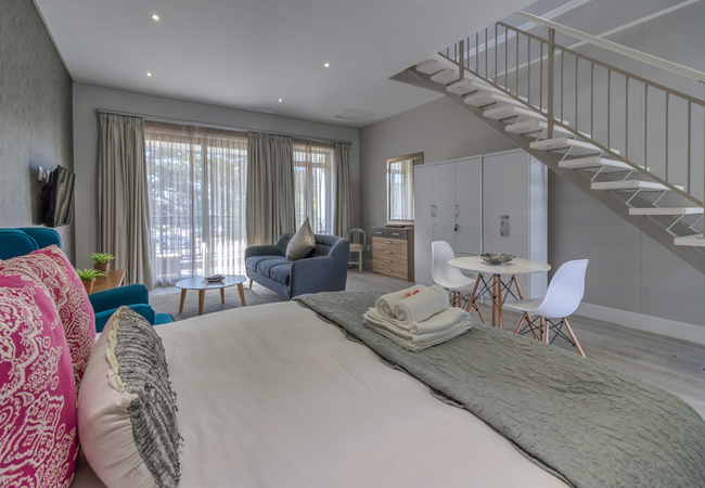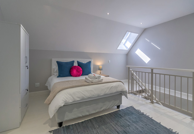 Vyfster 104 can accommodate up to four guests. There is also a loft-style bedroom upstairs. The main bedroom upstairs contains a Queen-size bed and an open en-suite bath, toilet and washbasin. Downstairs is a Queen-size bed and a bathroom fitted with a shower, a toilet and a washbasin.