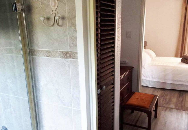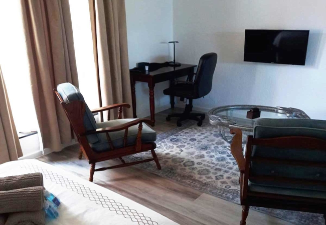 Apartment A can accommodate two guests and is furnished with a double bed. The bathroom is fitted with a shower, basin and toilet. Each apartment has a comfortable seating area, storage space, safe for valuables, Smart TV with satellite channels and free Wi-Fi. The kitchenette contains a bar fridge, a microwave, a mini-oven with a 2-plate stove, kettle, crockery, cutlery and utensils The apartments open onto a semi enclosed area with table and chairs.