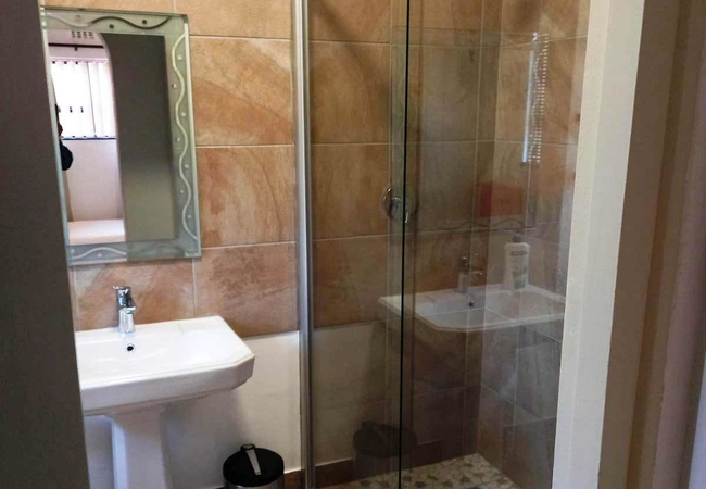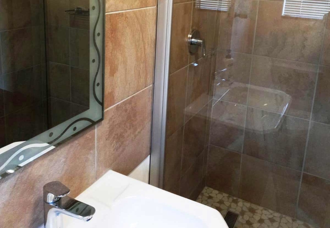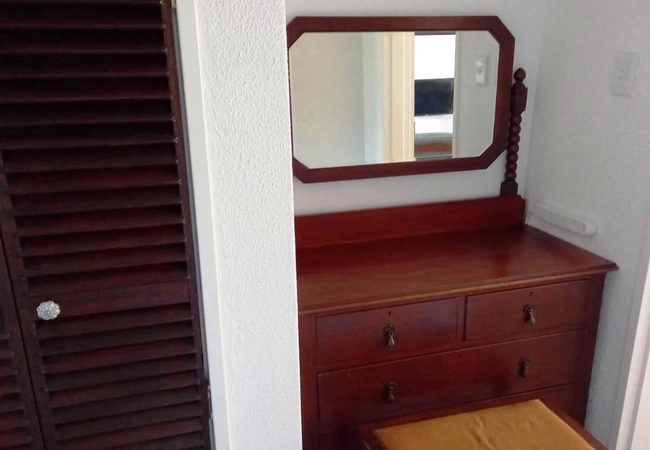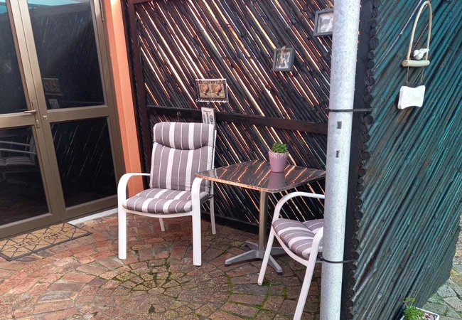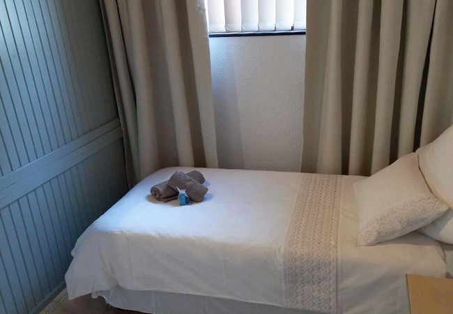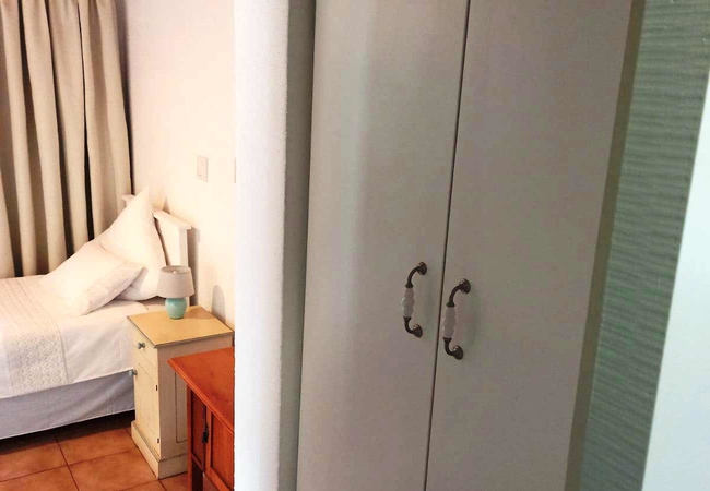 Apartment B can accommodate one guest and is furnished with a single bed. The bathroom is fitted with a shower, basin and toilet. Each apartment has a comfortable seating area, storage space, safe for valuables, Smart TV with satellite channels and free Wi-Fi. The kitchenette contains a bar fridge, a microwave, a mini-oven with a 2-plate stove, kettle, crockery, cutlery and utensils The apartments open onto a semi enclosed area with table and chairs.