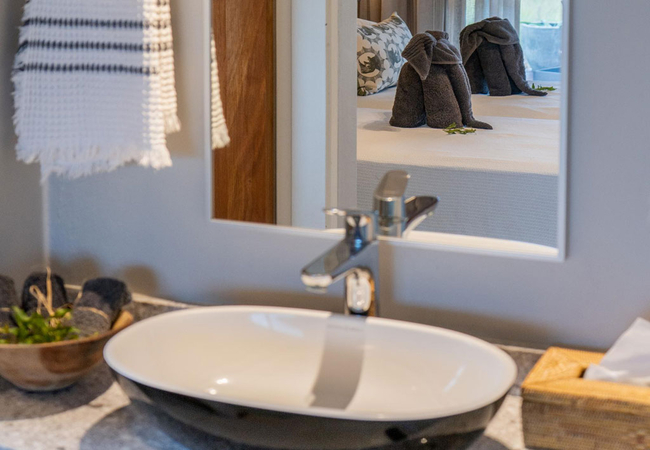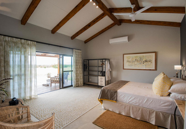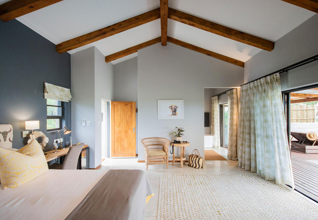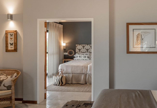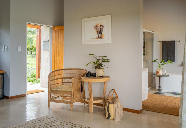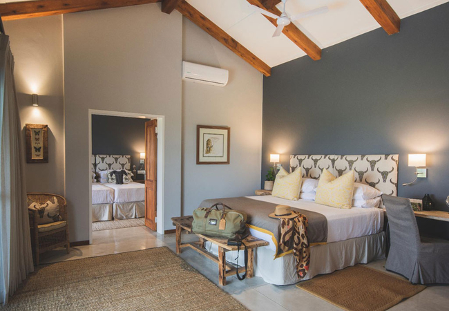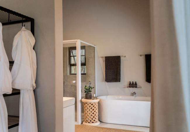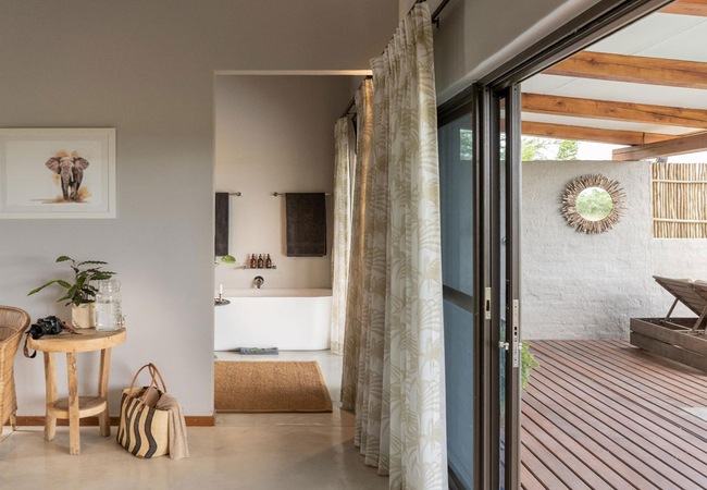The Safari Room is furnished with a King-size bed and has a full en-suite bathroom fitted with a bath, shower, toilet and basin. Amenities such as linen, bath and swimming towels, hand and body wash, lotion and insect-repellant soaps are provided. The suite opens onto a deck with outdoor furniture and a private plunge pool.