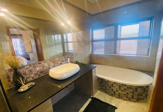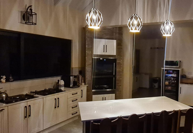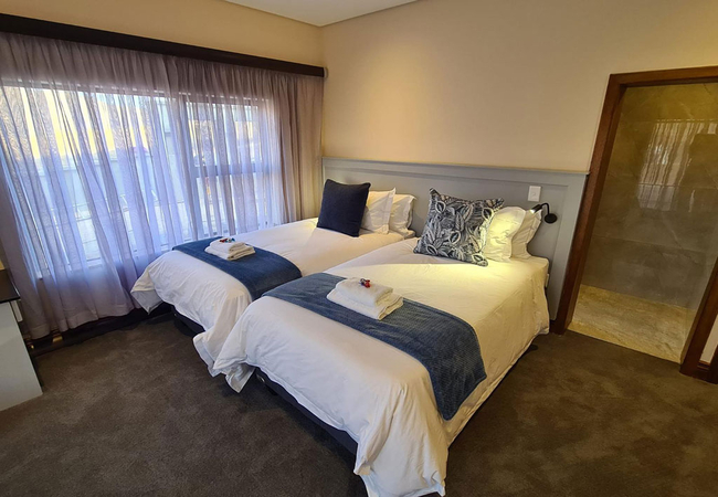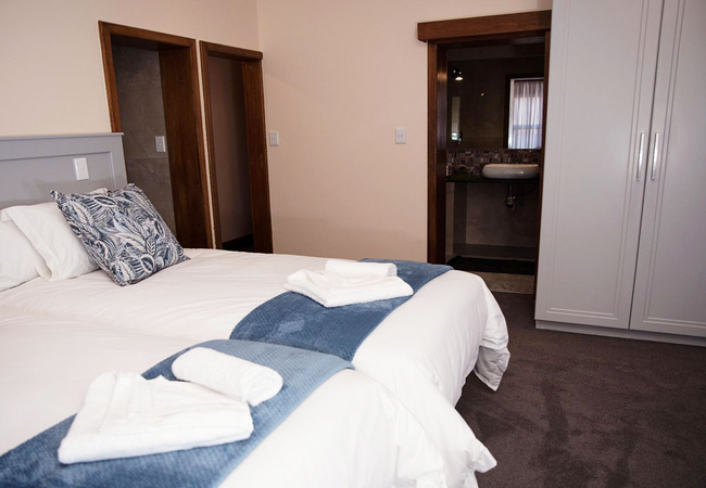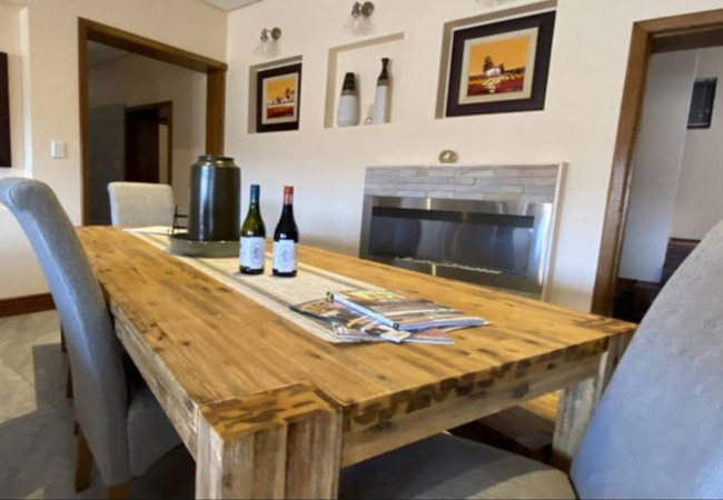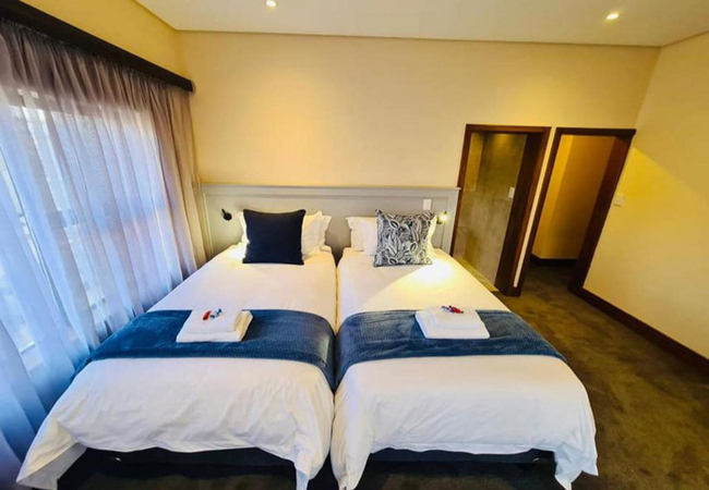 Walte Rest is a double-storey holiday home that can accommodate a large group of 12 guests in six bedrooms. All the rooms are furnished with twin beds. There are five en-suite bathrooms fitted with a bath, shower, toilet and basin. There is also one separate bathroom fitted with a shower, toilet and basin.The home features a fully equipped kitchen, an open-plan living area with a TV that has full DStv channels, a wood burning fireplace and leads onto a patio with a braai / BBQ area. The property boasts free Wi-Fi access, an infinity pool and secure parking for vehicles. The home is serviced daily (except Sundays).