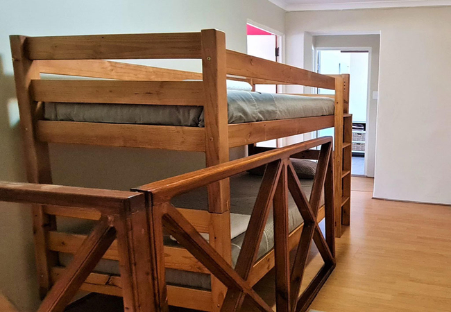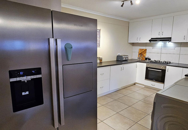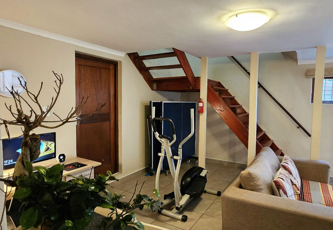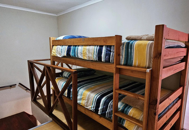 Walters Lane Garden Apartment has two bedrooms and one bathroom. The main room is furnished with a double bed, air-conditioning and a TV. The second bedroom is furnished with a double bed and the landing has a bunk bed ideal for children. The shared bathroom is fitted with a shower, basin and toilet. There is also a guest toilet downstairs. The kitchen is fully equipped and includes a dishwasher, washing machine and dryer. For those who would like to get some work done, a workstation with a laptop and access to free Wi-Fi is available. The air-conditioned living area offers a comfortable lounge suite and a TV with streaming services. There is a private garden with braai facilities and garden furniture, while the patio directly outside the unit has a dart board and a table tennis table. Use of the main house facilities like a deck with stunning views, dartboard, gas braai, pool table, tennis table and swimming pool can be used on request if the main house hasn't been booked during your stay. Parking is available on-site for one car. The accommodation has solar power to avoid loadshedding.