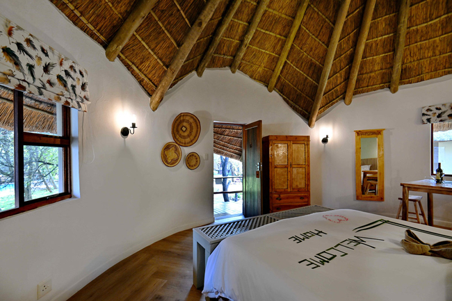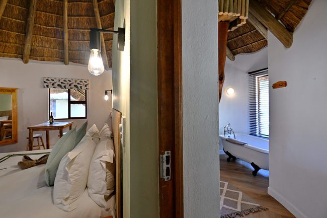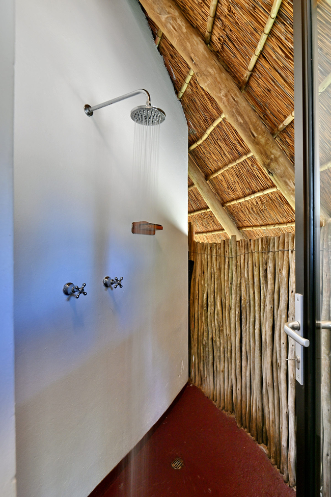 The lodge features ten thatched rondawels, each designed to comfortably host two guests sharing. The rooms are thoughtfully furnished for a semi self-catering stay, and each includes a pool view, tiled floors, fresh linen and towels, and an en-suite bathroom complete with both an indoor bath and an outdoor shower. Guests should note that the bedrooms do not include televisions, allowing for an uninterrupted experience of tranquility.