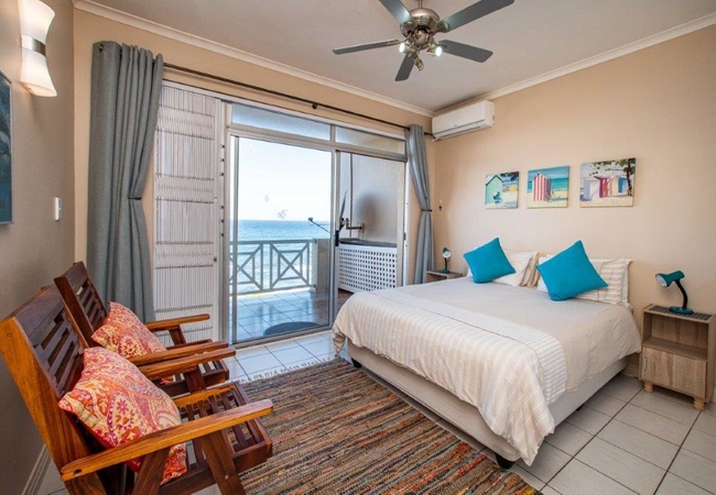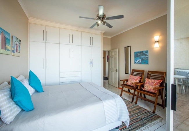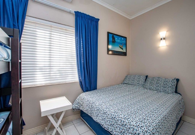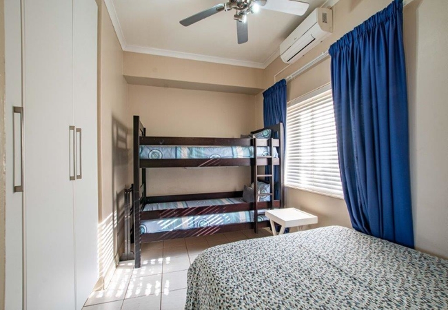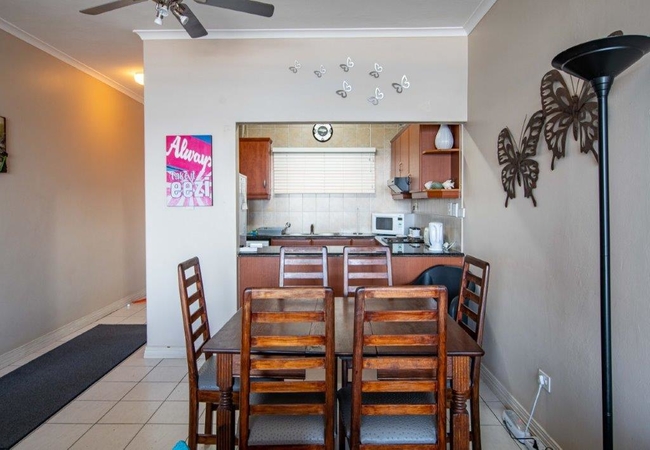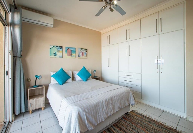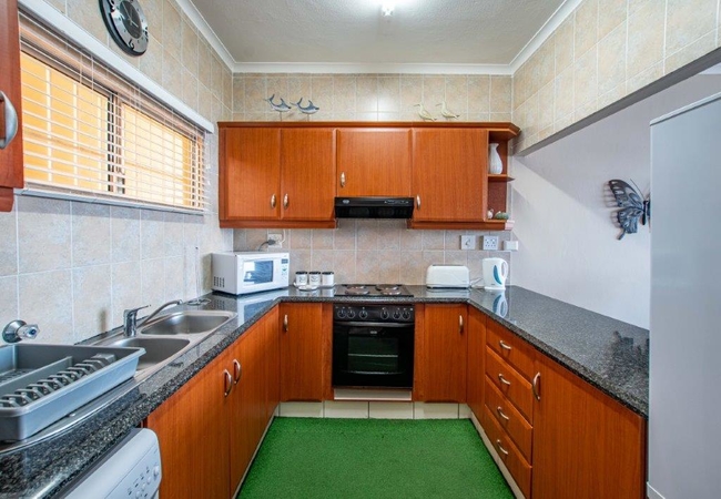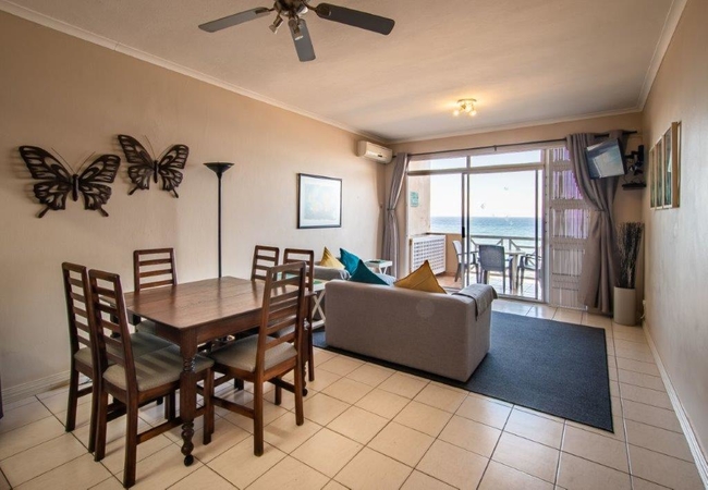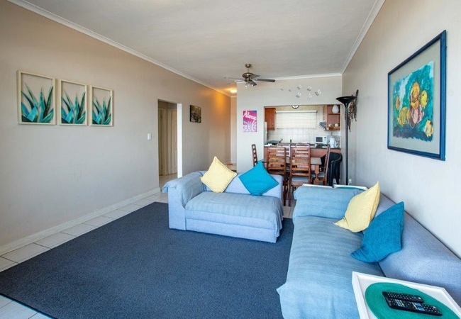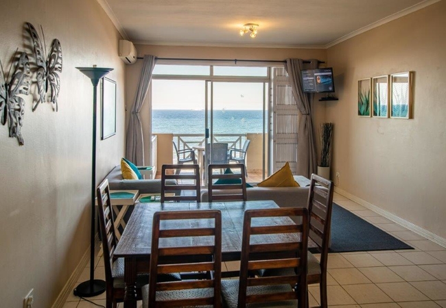 This neat and comfortable apartment has uninterrupted sea views from the balcony overlooking the swimming pool. Waterfront 24 is a self catering holiday apartment sleeping four guests. The first bedroom is furnished with a Queen-size bed and the second bedroom is furnished with a three-quarter bed and a bunk bed. There is one bathroom with a bath and a shower. Both rooms as well as the lounge have air-conditioning. The living area is open plan and there is a TV with satellite channels. The kitchen is fully equipped for your self catering requirements and there is a dining table where you can enjoy your meals. Outside on the balcony there is a table and chairs and stunning beach and ocean views, the ideal place to unwind and relax.