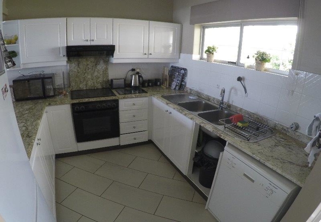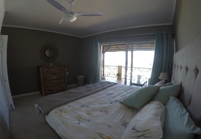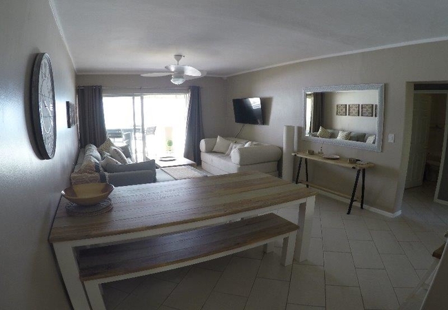 The fully equipped kitchen has a stove, oven, fridge / freezer, microwave, dishwasher and a breakfast bar with stools. In the dining area there is a four seater dining table and benches. The lounge has air-conditioning and has a TV with DStv and free Wi-Fi. This area opens onto the spacious sheltered balcony with outdoor dining furniture and beautiful sea views.