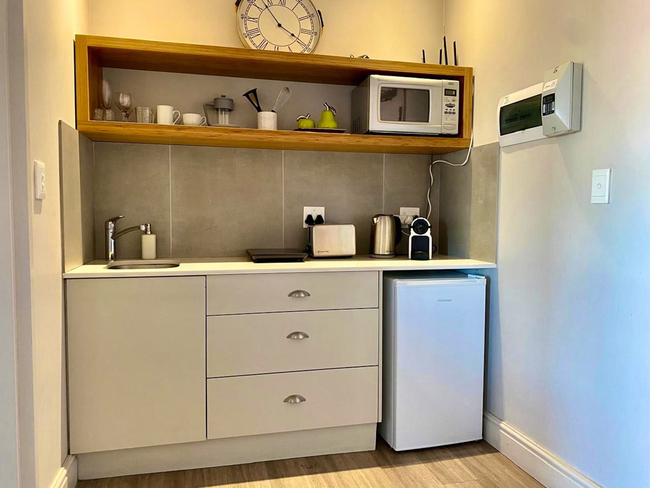 Waterfront Apartment 14 is a modern self-catering apartment with stunning sea views, ideally located within easy walking distance of Hermanus’s cliff paths, restaurants, shops, and art galleries. Suitable for two guests, the apartment comprises one bedroom, one bathroom, a fully equipped kitchen, and a welcoming living area. The bedroom features a queen-size bed and an en-suite bathroom with a shower, toilet, and basin, and offers partial views of the ocean. The open-plan kitchen includes an induction cooker, microwave, toaster, kettle, and a Nespresso coffee machine, while the dining area provides seating for two. The lounge is furnished with a comfortable lounge suite, air conditioning, a TV with Netflix, and Wi-Fi access. Guests can enjoy the complex’s communal rooftop swimming pool, which boasts panoramic views, and rooftop parking is available for convenience.