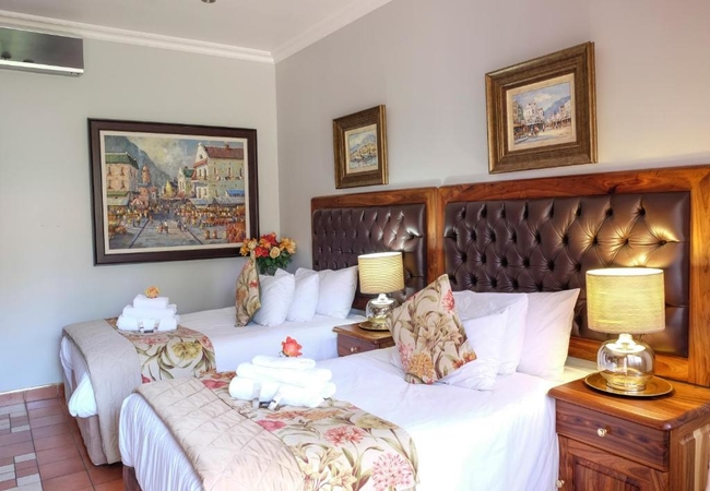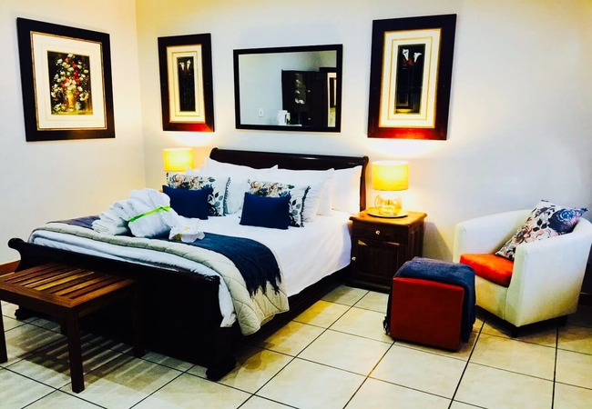 King Suite (Private Patio) - The suite is furnished with a King-size and a three-quarter bed and has two bathrooms. There is a private garden. Rooms are equipped with climate control air-conditioning, fiber internet, telephones, a safe, desk, DStv, mini bar and tea and coffee facilities.