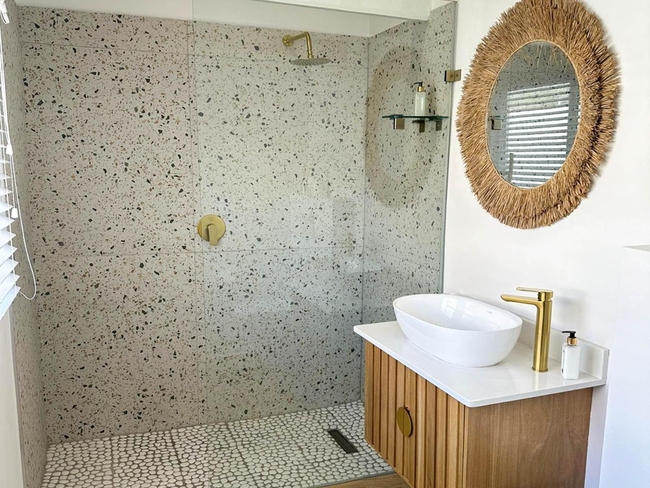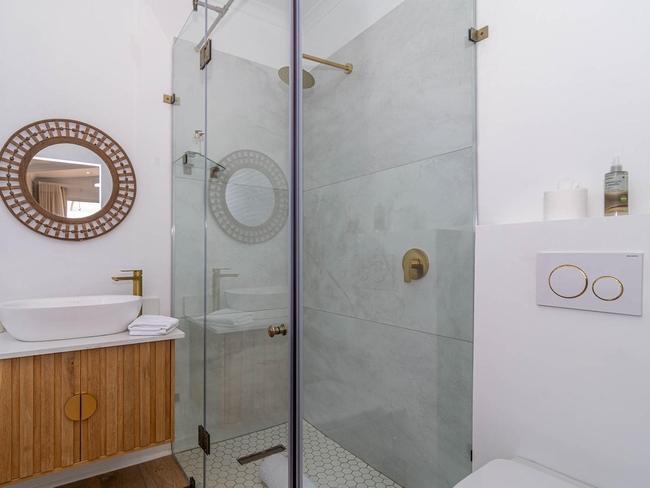 The holiday home features four bedrooms sith four bathrooms. Bedroom 1 is furnished with one extra-large double bed, and Bedrooms 2, 3, and 4 each furnished with one large double bed.