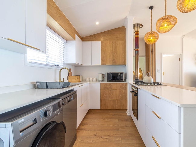 The spacious living area features a cozy fireplace, creating a warm and inviting atmosphere for relaxation, while the fully equipped kitchen includes a gas stove, oven, microwave, refrigerator, toaster, dishwasher, washing machine, and tumble dryer, making meal preparation and cleanup effortless.