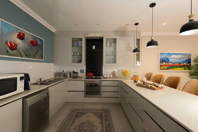 The open-plan living space incorporates a well-equipped kitchen fitted with a stove, oven, microwave, dishwasher, fridge-freezer, and tea- and coffee-making facilities. A washing machine and tumble dryer are also available for longer stays. Meals can be enjoyed at the six-seater dining table, while the lounge offers comfortable seating and a Smart TV with streaming services.