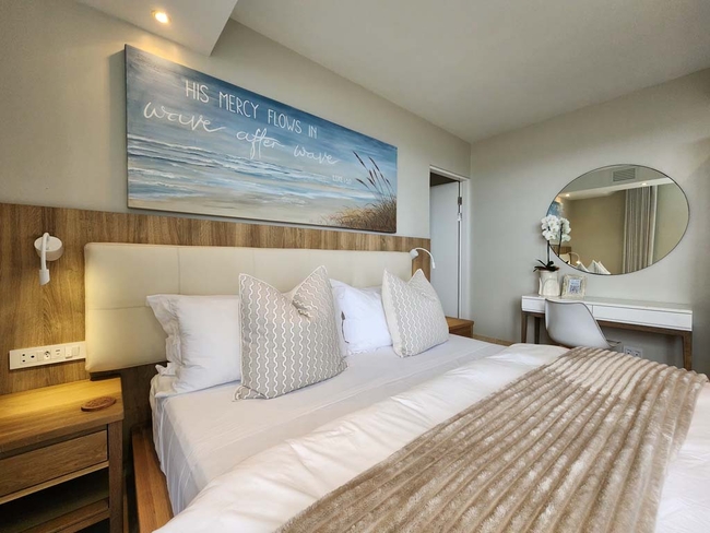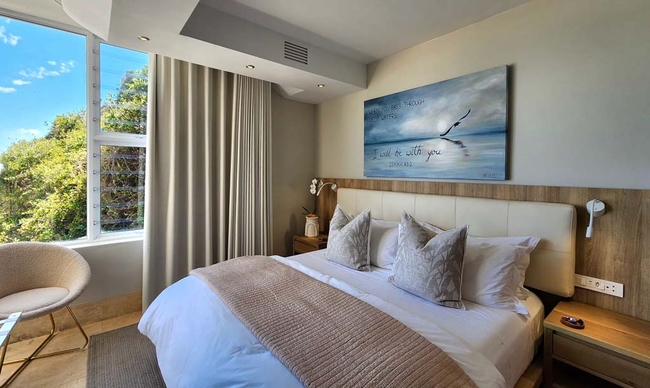 This is the penthouse of the Waves of Grace. There is a double bed, en-suite bathroom with a bath and shower, lounge area and balcony. All rooms have air conditioning, free Wi-Fi and complimentary toiletries. There is a daily maid service, shared lounge, braai facilities, fully equipped kitchen available, grocery deliveries (additional), ironing service (additional).