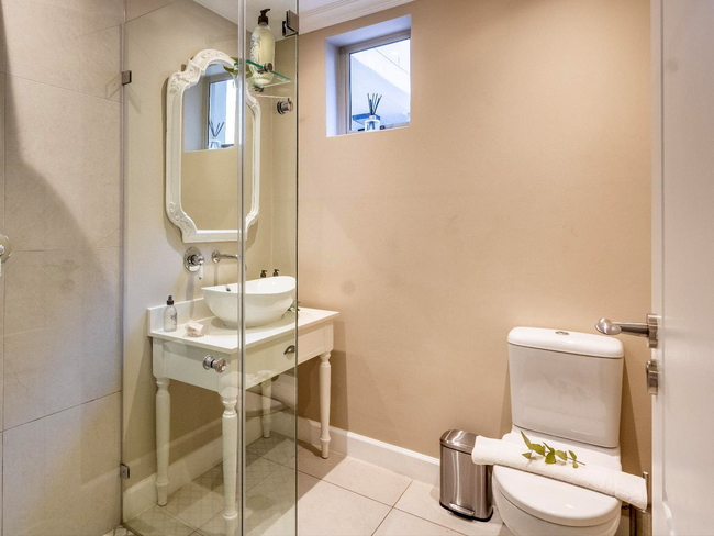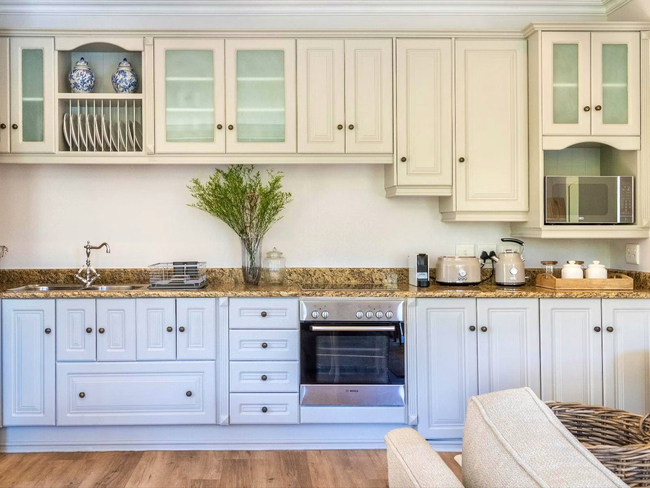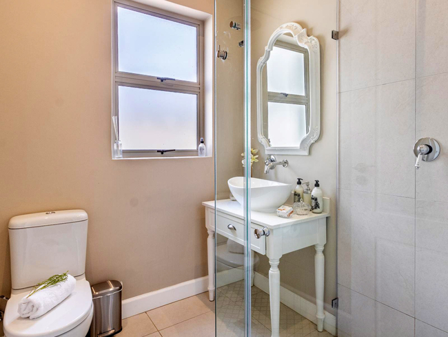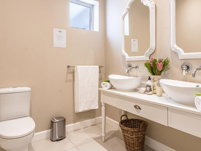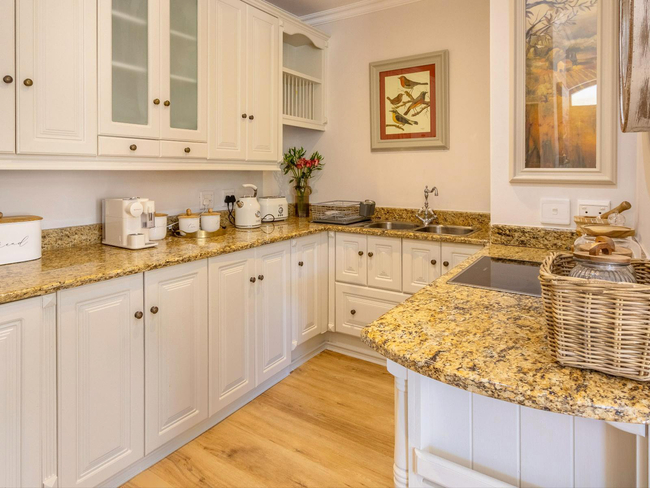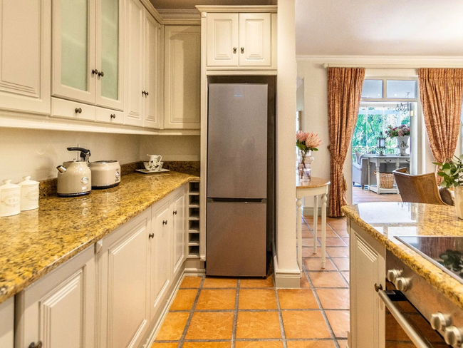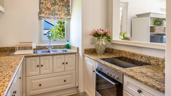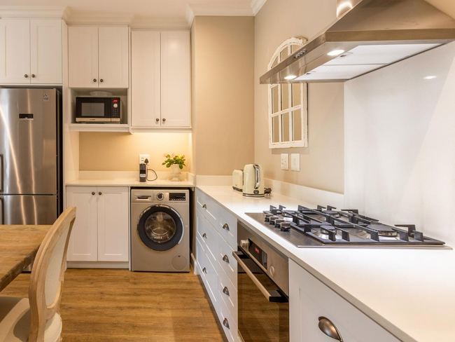 The kitchen is equipped with a stove, oven, microwave, refrigerator, dishwasher, toaster, coffee and tea-making facilities, and all necessary kitchen supplies, allowing for effortless meal preparation. Laundry needs are met with a washing machine and tumble dryer. Outside, furnished balcony seating provides a relaxing spot to enjoy the surroundings, and guests have access to two swimming pools within the estate, making Villa 27 ideal for a romantic getaway or a quiet Franschhoek escape.