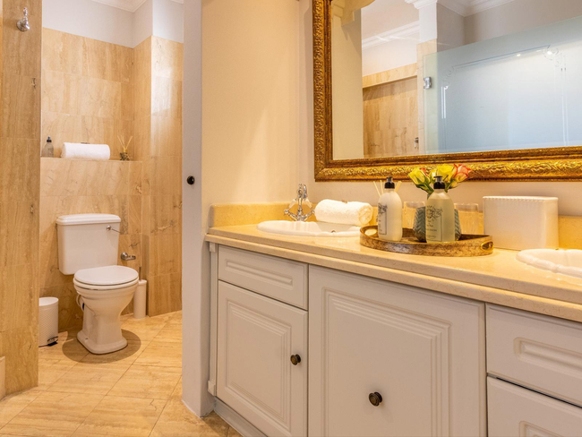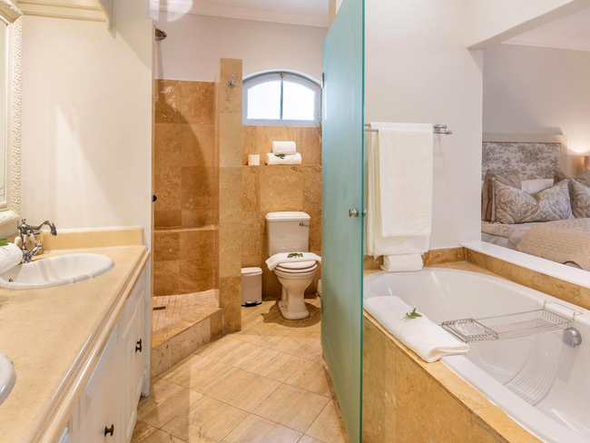 The bedroom provides a restful escape with a comfortable bed and a luxurious en-suite bathroom fitted with a separate bath and shower, towels, hairdryer, and essential amenities. Modern conveniences throughout the villa include air conditioning, Wi-Fi, TV with DStv or satellite channels, telephone, safe, desk, and non-feather pillows, while the property maintains a non-smoking environment. Additional practical touches such as a cot, ironing board, iron, and regular cleaning service ensure ease and comfort during your stay.