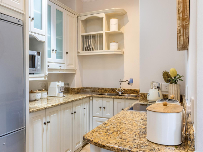 The kitchen is thoughtfully equipped for self-catering and includes a refrigerator, oven, microwave, dishwasher and toaster, together with coffee and tea-making facilities. Laundry appliances, including a washing machine and tumble dryer, are available, as well as an iron and ironing board.