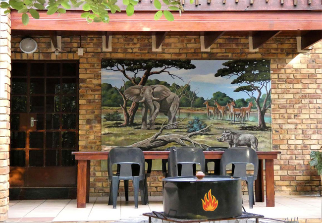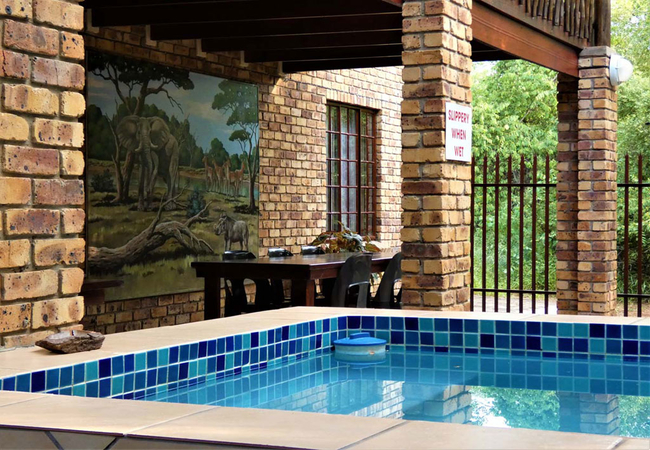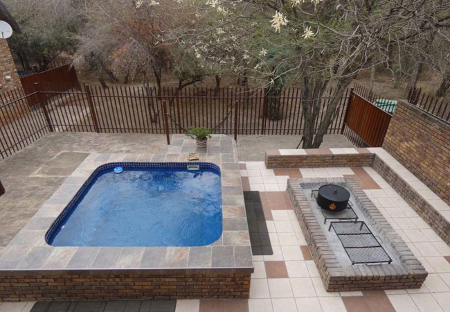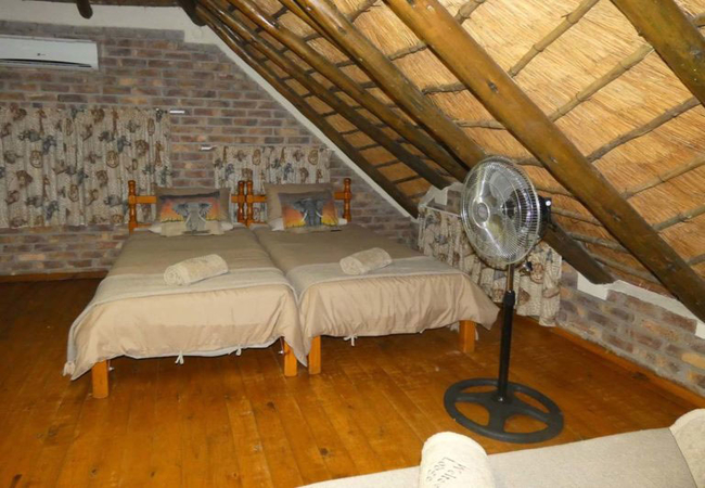 The Big Five is a large house which is decorated to represent the Big Five. It has two big family rooms, with air conditioning upstairs. Both family rooms are furnished with a double bed and two single beds. The air-conditioned room downstairs is furnished with a Queen-sized bed. It also has a small un-air conditioned room furnished with a single bed upstairs. There are two bathrooms, one fitted with a shower toilet and basin and the other fitted with a large bath, toilet and basin. There is also a separate toilet upstairs. The Big Five is equipped with fans, a television with a full satellite package on request and Free Wi-Fi. The kitchen is equipped with a deep freeze, a fridge, a stove, and the necessary appliances and accessories. Linen and bath towels are supplied, please bring own swimming towels. The Big Five has own splash pool and enclosed braai area.