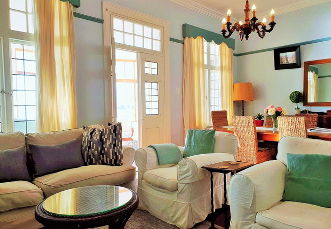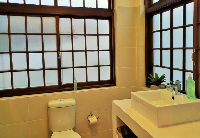 The villa boasts wooden floors, Colonial style high ceilings and modern touches throughout. There are four bedrooms and four bathrooms. Three bedrooms are furnished with a Queen-size bed and one bedroom is furnished with two single beds. Each room has its own en-suite bathroom. Three are fitted with showers, toilets and basins and one has a shower over the bath, a basin and toilet.