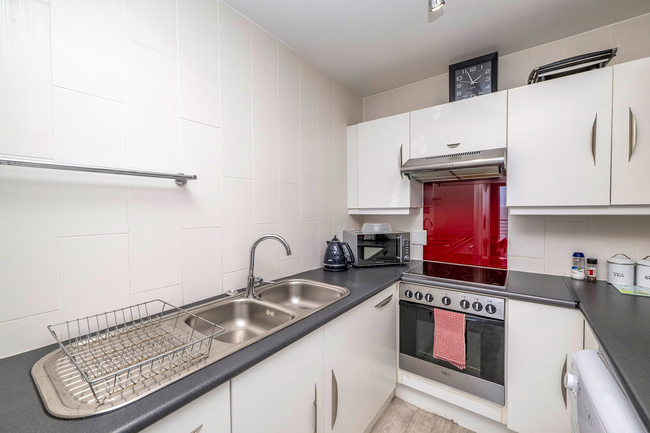 The inviting open-plan living area includes a fully equipped kitchen, offering a stove, oven, microwave, and fridge-freezer, along with a full set of cutlery, crockery, and essential tea and coffee-making facilities.