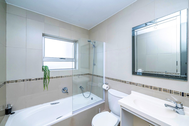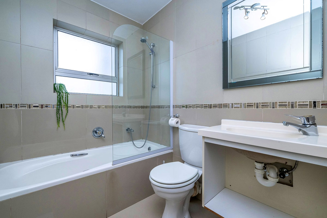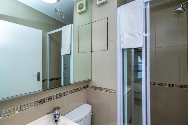 Designed to host up to four guests comfortably, the apartment consists of two well-appointed bedrooms and two bathrooms. The main bedroom is furnished with a double bed and includes a private en-suite bathroom, complete with a combined shower and bath.