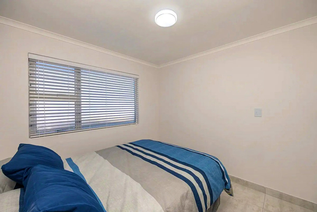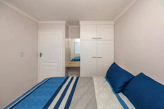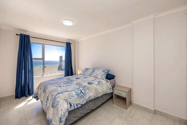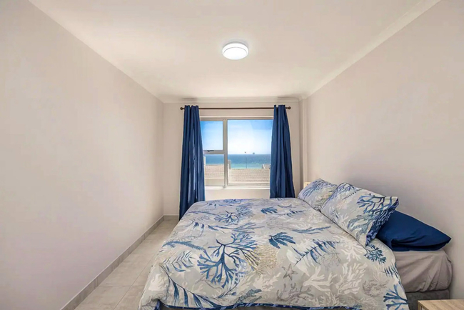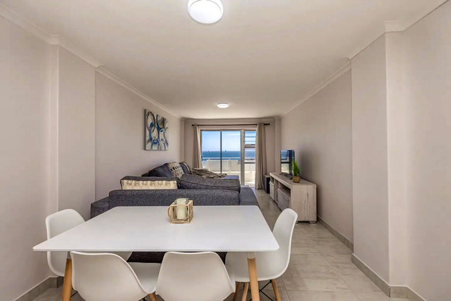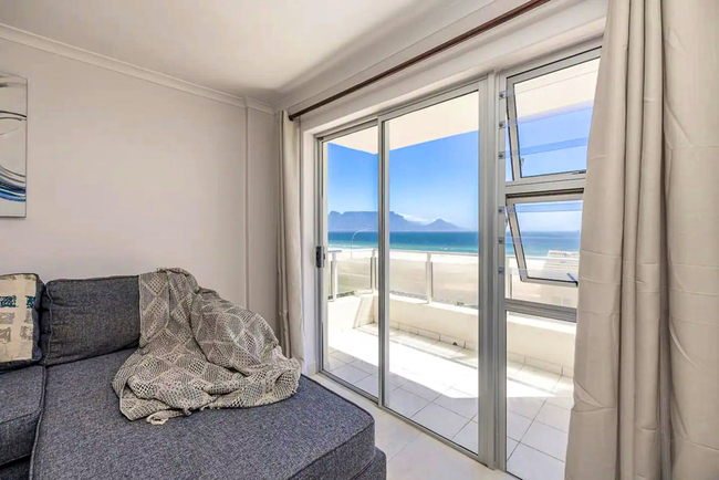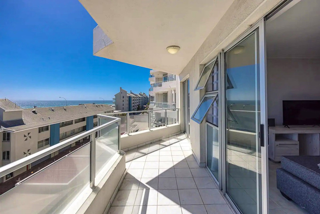 Glass doors lead from the lounge to a private balcony, ideal for enjoying a morning coffee or simply admiring the picturesque views of the Atlantic Ocean and the unmistakable silhouette of Table Mountain in the distance. For those warm Cape Town days, guests are welcome to enjoy the complex’s communal swimming pool.