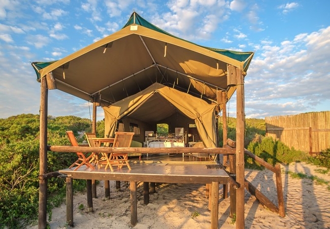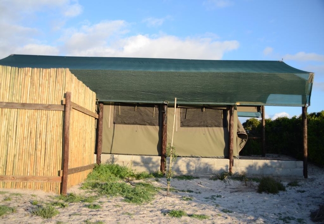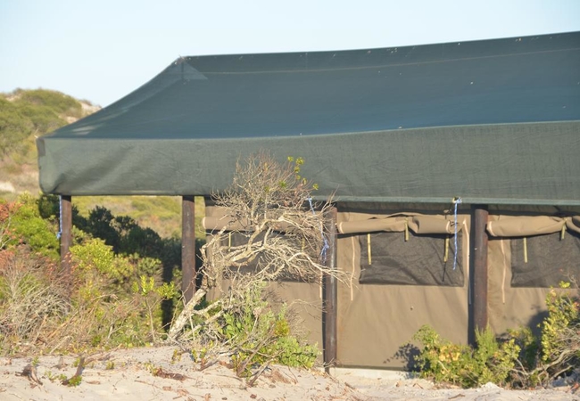 Three luxury tents are set up in the bush behind a sand dune. They are 500 meters from a 40km long unspoilt sandy beach. Secure parking is provided.