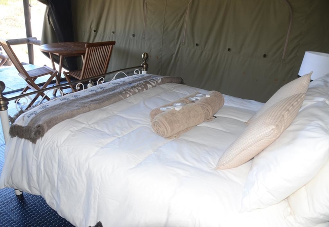 The main tent is furnished with a double bed and has an en-suite bathroom. There is an adjoining tent with two single beds which share the en-suite bathroom. The tent has a small kitchenette and braai facilities.