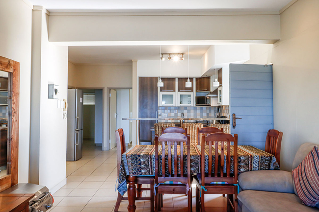 Whale Rock 23 Holiday Apartment comfortably sleeps up to six guests and features three tastefully appointed bedrooms along with two bathrooms. The main bedroom is fitted with a double bed and includes an en-suite bathroom complete with both a bath and a shower. The second bedroom also offers a double bed, while the third is arranged with two single beds. These two bedrooms share a second bathroom, which is also fitted with a bath and a shower. Quality linen and bath towels are provided for guests’ convenience, though beach towels should be brought along. The apartment’s kitchen is fully equipped to meet self-catering needs, offering a stove, oven, microwave, kettle, toaster, and fridge-freezer, along with essential cutlery and crockery. Additional conveniences include a washing machine, tumble dryer, and a breakfast bar with stools. The open-plan lounge and dining area offers a comfortable space for guests to unwind or enjoy shared meals and features a television for entertainment. Large sliding doors open from the living area onto a spacious balcony furnished with outdoor seating, providing the perfect setting to take in the uninterrupted sea views. Guests also have access to communal amenities including a swimming pool and braai facilities. Secure parking is provided for one vehicle.