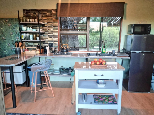 This cosy little cabin rests in a wildflower meadow surrounded by whispering pines, with tranquil views over the apple and pear orchards. Designed as an open-plan retreat for two, it features a comfortable bedroom and sitting area complete with a fireplace, perfect for unwinding after a day in nature. The fully equipped kitchen includes a refrigerator, microwave, toaster, two-plate stove, and all the essentials for preparing home-style meals. A dining table provides space to enjoy meals together, while modern comforts such as Wi-Fi, TV with DStv and Netflix, and an electric blanket ensure a pleasant stay in any season. The private bathroom offers a separate tub and shower along with complimentary amenities and a hairdryer. Outdoors, guests can relax on the patio furnished with comfortable seating, enjoy a meal in the outdoor dining area, or make use of the braai facilities. With mountain and garden views, a private hot tub, and peaceful surroundings, this cabin is an inviting hideaway for those seeking rest and romance in nature.