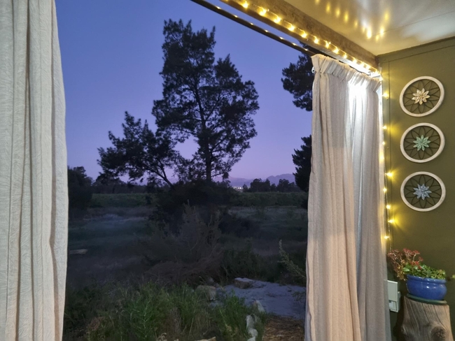 This intimate cabin is nestled within a wildflower meadow bordered by whispering pines, offering sweeping views over apple and pear orchards.