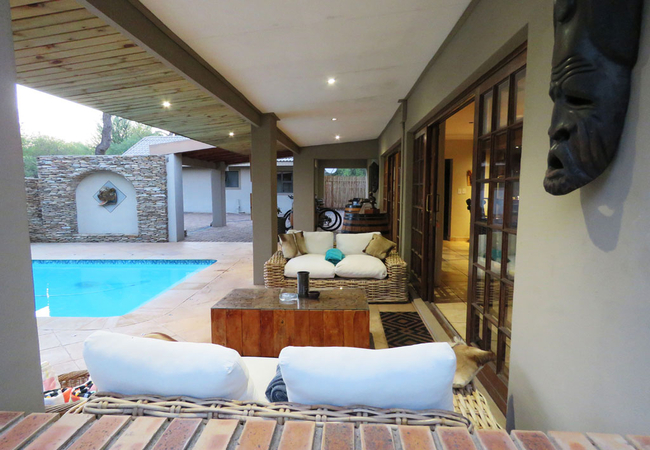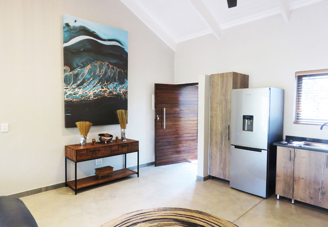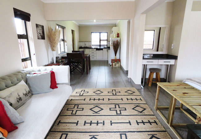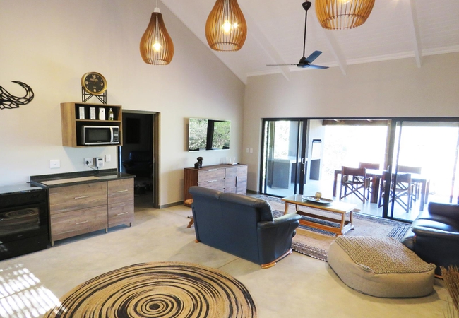 The villa can accommodate up to 4 adults with 1 child, and comprises 2 air-conditioned bedrooms, 2 bathrooms, and an open-plan kitchen and living area. Both bedrooms contain a queen-size bed with en-suite bathroom. Each room has a big sliding door leading onto an extended room patio. One of the bedrooms includes a double bed sleeper couch suitable for a child under 12 years. The kitchen is fully equipped for self-catering and contains a stove, oven, fridge-freezer, microwave, and cutlery and crockery. The lounge has a comfy lounge suite and a wall-mounted flat-screen TV. Free Wi-Fi access is also provided. The living space leads out onto the patio with an outside dining area overlooking directly onto the greenbelt. There is also a private boma area with a fire pit and stainless steel braai. Safe and secure parking is provided under the double carport.