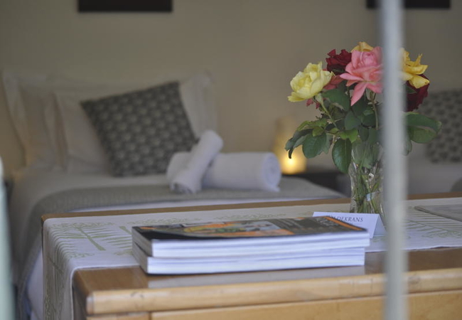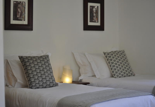 This funky and fun room is eclectically furnished and filled with bits of contemporary South Africa. Traditional King / twin beds with great bedding. Under floor heating for cool winters, bath and separate shower, art books and TV. Views of the garden.