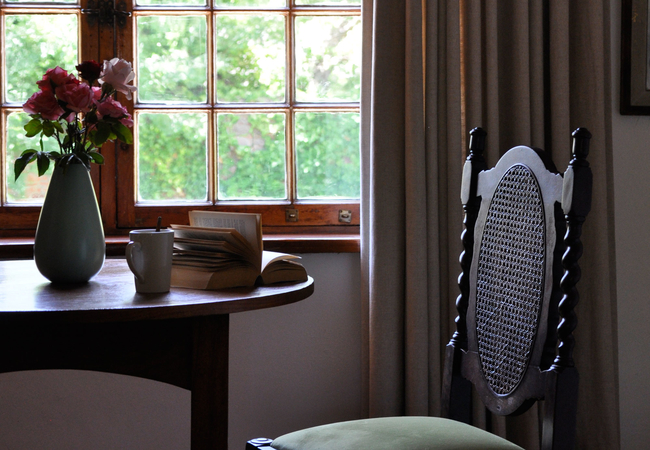 This softly furnished room has the best views of the garden and swimming pool. Traditional four poster bed with great bedding contrasted with modern art. Writing table and TV. This room is the owners' favourite and makes for a tranquil and rejuvenating stay.