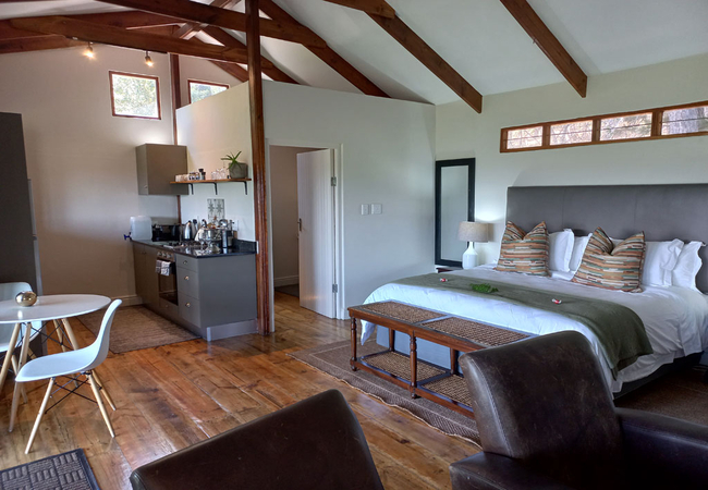 Wild Iris @ Forest Valley is a romantic cottage in Knysna sleeping two guests. The open plan cottage is furnished with a contemporary Queen-size bed and an en-suite bathroom fitted with a shower, hand basin and WC.