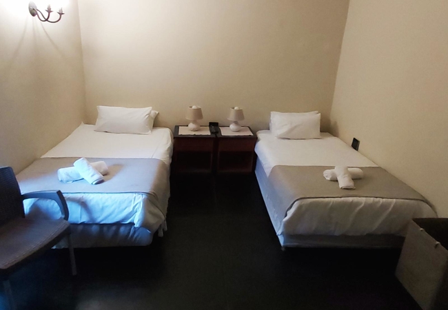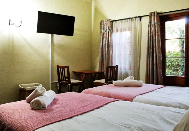 This room consists of 2 single beds with a shared bathroom that is located downstairs. This room is situated on the second floor of the Lodge with a incredible view of the garden and the Mountain. There is Wi-Fi available. Shared kitchen facilities.